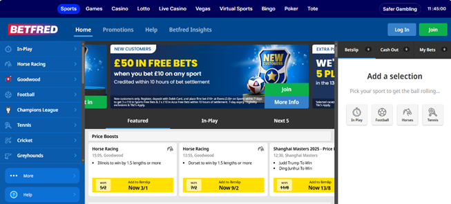 Betfair is one of the UK’s most established names, well known both for its Sportsbook and its Exchange, which allows customers to bet against each other. Its strengths lie in competitive odds, strong market variety, and innovative bet types such as Bet Builders and Accumulators. This makes it attractive for bettors who like to customise or combine bets.