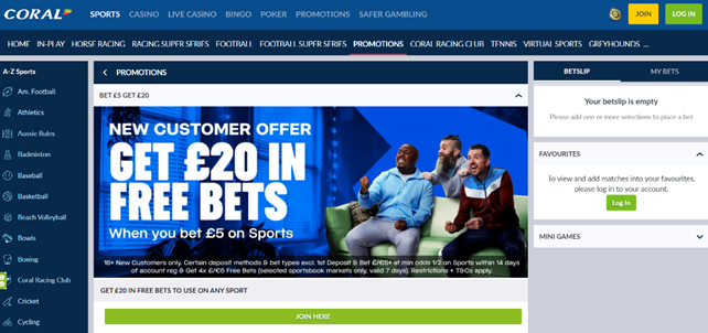 The Bet £5 Get £20 offer from Coral grants you access to a diverse betting platform that features a huge range of sports and markets, alongside regular promotions and free-to-play games.