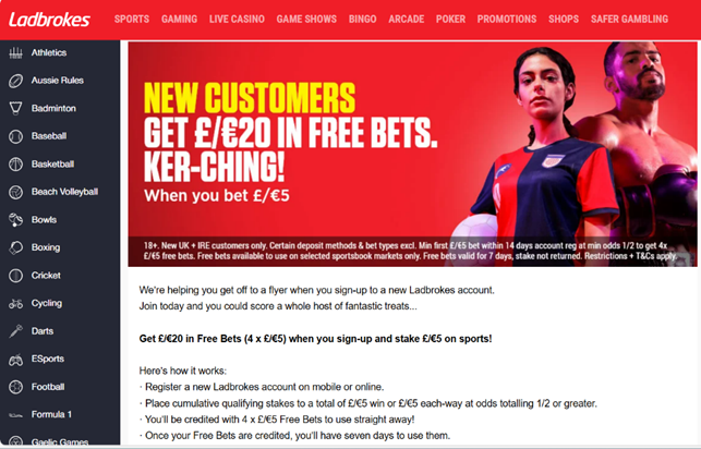 The Ladbrokes Bet £5 Get £20 welcome bonus works in pretty much the same way as Betfair’s: