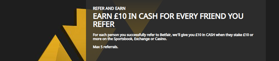 Existing customers will have the ability to earn £10 in cash for every friend they refer to the Betfair. To qualify, the referred friend must stake £10 or more at the Sportsbook, Exchange or Casino. Max 5 referrals. (T&Cs Apply)