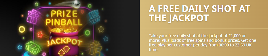 Take part in the Prize Pinball Jackpot promo every day to win a prize up to £1,000 or more! Other prizes available with this offer include Free Spins and bonus cash. You will get one free play per day from 00:00 to 23:59 UK time. (T&Cs Apply)
