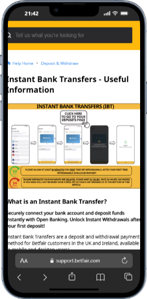 Visa / Mastercard (Debit Card)Within hours to 1 business day1 to 3 business days (some banks up to 5)Min £5 / Max £33,000No Betfair fee