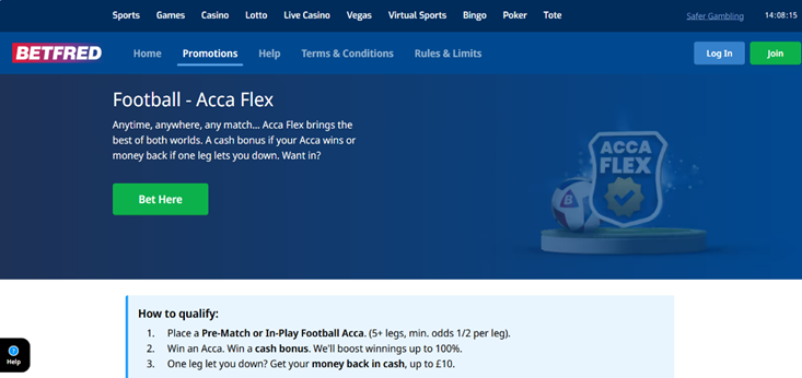 | Acca Flex | Place a ACCA football bet of 5+ selections for an odds boost and money back if one selection loses. | Free-To-Play, Boosted Odds |