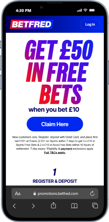 18+. GambleAware.org . New GB customers only. Min £10 debit card deposit. Place a £10+ bet on a sportsbook at min odds 1/1 (2.0) each leg. Receive 2 x £10 free bets within 24 hours of bet settlement, and further 2 x £10 casino bonus the next day. T&C’s apply. Full T&Cs