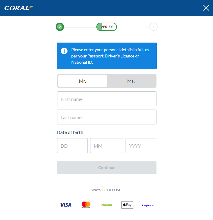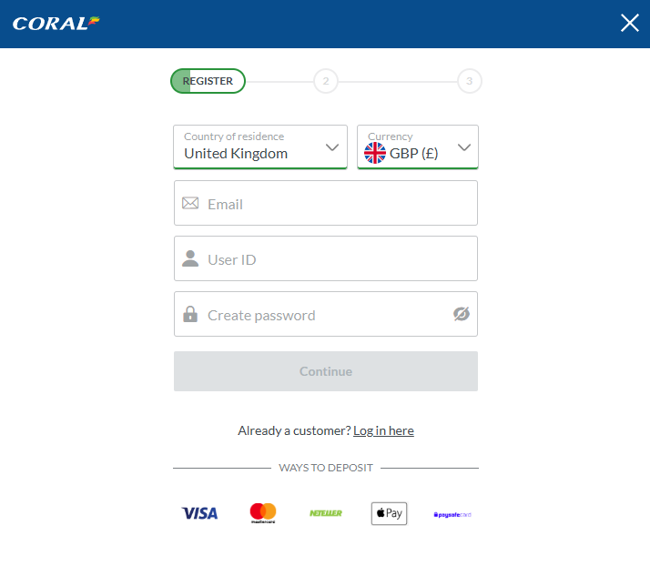 To successfully claim the Coral Sign Up Bonus you will need to register for a new account, make a qualifying deposit, followed by a qualifying wager. Read through the steps below to help guide you through the claiming process: