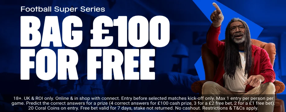 The Coral Welcome Bonus provides 4x £5 Free Bets that can be used on any football markets that aren’t multiple bets (i.e. Lucky 15s). Note that the stakes will not be returned on winning bets and each Free Bet must be used in its entirety. Here are a couple of recommended ways of using the Free Bets on football: