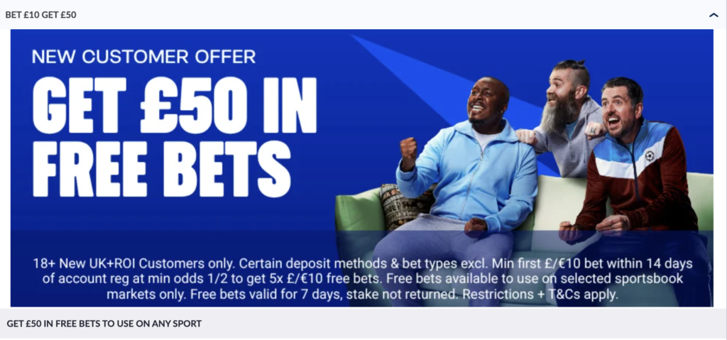 T&Cs – 18+ New UK+ROI Customers only. Certain deposit methods & bet types excl. Min first £/€10 bet within 14 days of account regat min odds 1/2 to get 5x£/€10 free bets. Free bets available to use on selected sportsbook markets only. Free bets valid for 7 days, stake not returned. Restrictions + T&Cs apply.