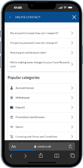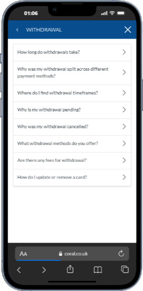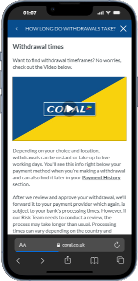 Our review also showed that Coral supports different popular UK withdrawal methods, and each works with its own limits, processing time, and different conditions that have to be met before it can be successful.