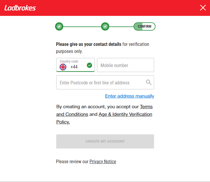 There is currently no Ladbrokes Promo Code needed to claim the Welcome Bonus. While there isn’t a ‘Promo Code’ field in the Ladbrokes Registration Form, a code could be required for future welcome offers. Always read through the terms and conditions of a welcome offer before registering.