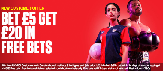 18+. New UK + IRE customers only. Certain deposit methods & bet types excl. Min first £/€5 bet within 14 days account reg at min odds 1/2 to get 4x £/€5 free bets. Free bets available to use on selected sportsbook markets only. Free bets valid for 7 days, stake not returned. Restrictions + T&Cs apply.