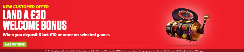 There is a separate Ladbrokes Casino Welcome Offer which can be claimed instead of the Sportsbook Welcome Bonus. The promotion gives new customers a £30 Casino Bonus when they bet £10 or more on any Slots and selected Live Casino games.