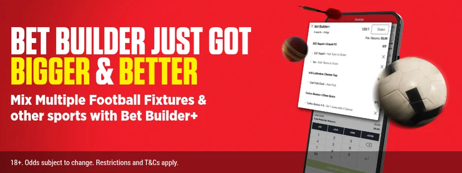 The new Bet Builder+ feature gives you the ability to combine multiple Bet Builders into one bet and select Bet Builder markets from different football matches and build them into one wager. Plus, if one selection is void, the bet continues with the remaining legs, and the odds are recalculated accordingly. (T&Cs Apply)