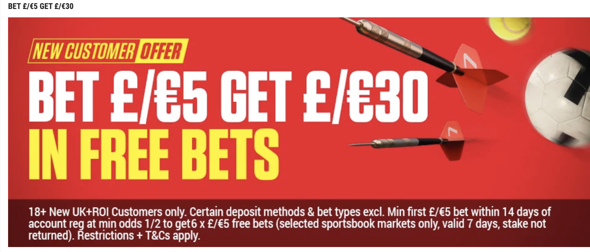 T&CS – 18+ New UK+ROI Customers only. Certain deposit methods & bet types excl. Min first f/€5 bet within 14 days of account reg at min odds 1/2 to get6 x f/€5 free bets (selected sportsbook markets only, valid 7 days, stake not returned). Restrictions + T&Cs apply.