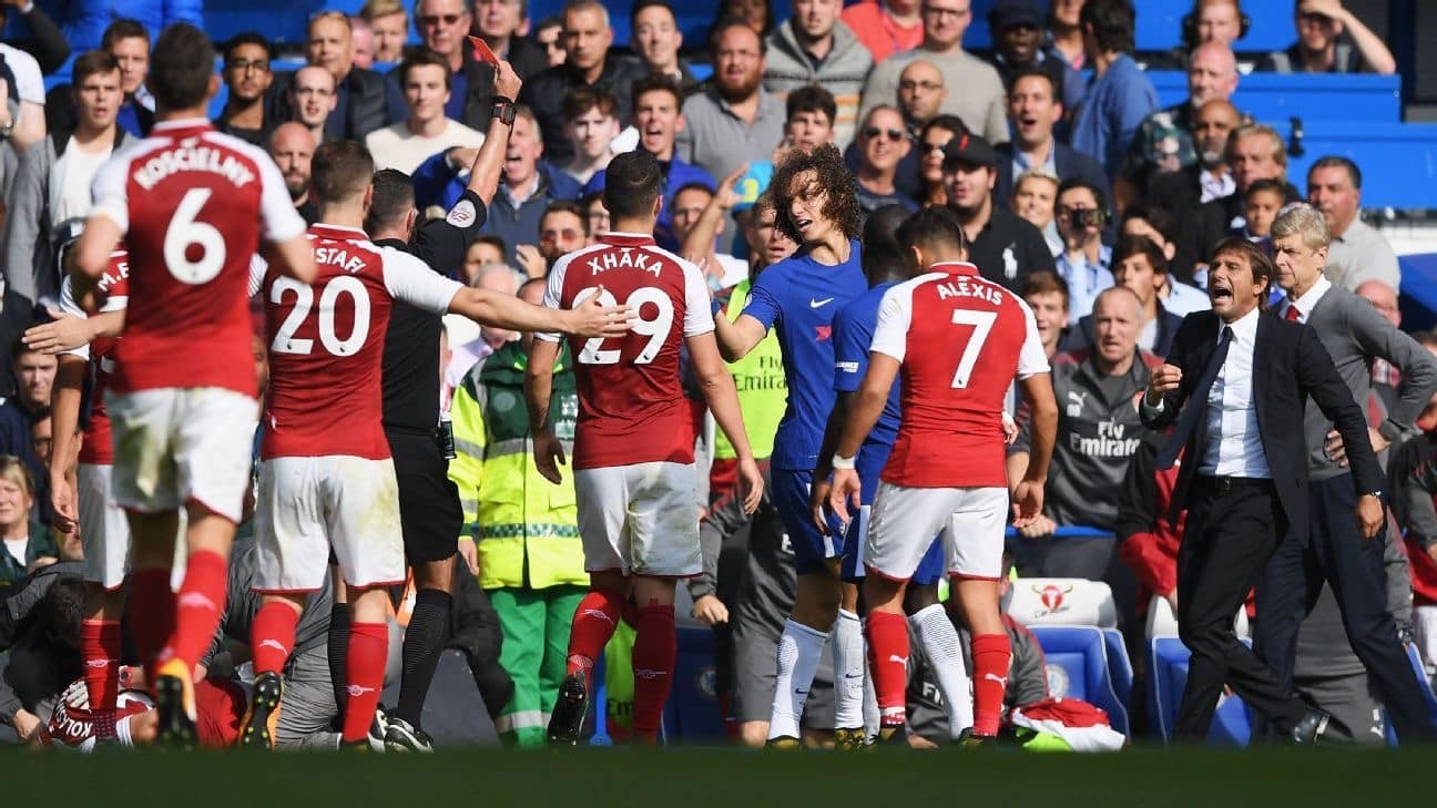 For the third game in a row against Arsenal, Chelsea ended with 10 men. This time David Luiz was sent off for a late tackle on Kolasinac.