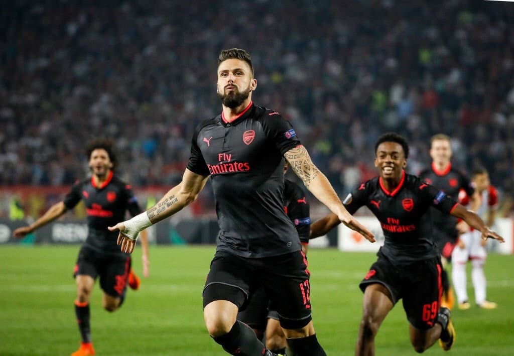 A sublime over-head kick from Olivier Giroud gave Arsenal a hard-fought 1-0 win over 10-men Serbian side Red Star Belgrade.